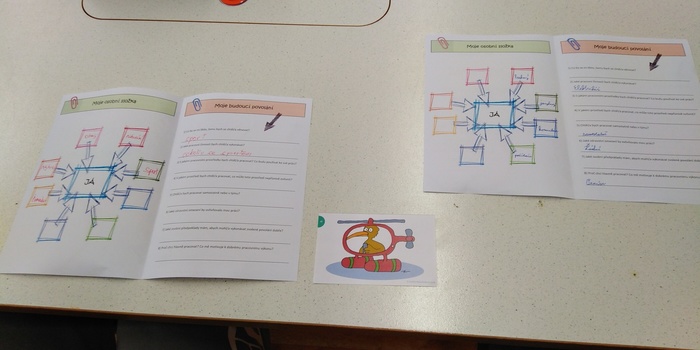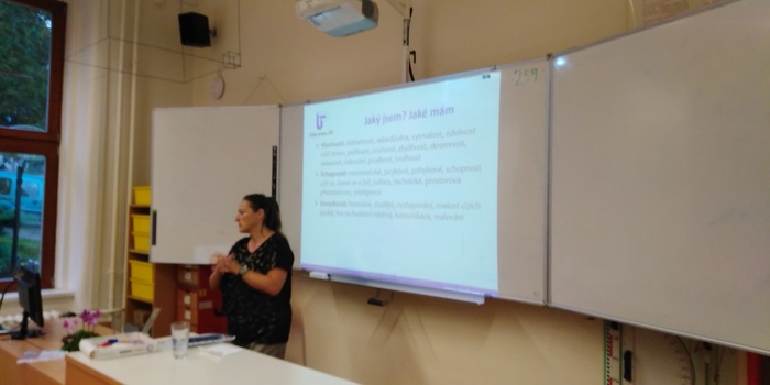 Paní z úřadu práce také připomněla důležitost sebepoznání – tedy toho, aby si každý žák uvědomil, co ho baví, v čem je dobrý a jaké má předpoklady pro konkrétní obory. K tomu využila materiály, s kterými žáci pracovali - přemýšleli, co je baví, jaké mají vlastnosti a schopnosti a dále se zamýšleli nad jednotlivými nároky profesí.