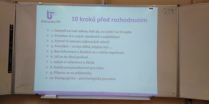 Beseda byla velmi přínosná a žáci měli možnost klást dotazy a získat odpovědi na to, co je ohledně volby školy a budoucnosti zajímá. Děkujeme paní lektorce za návštěvu a cenné rady, které jistě pomohou našim deváťákům při důležitém rozhodování o jejich dalším směřování.