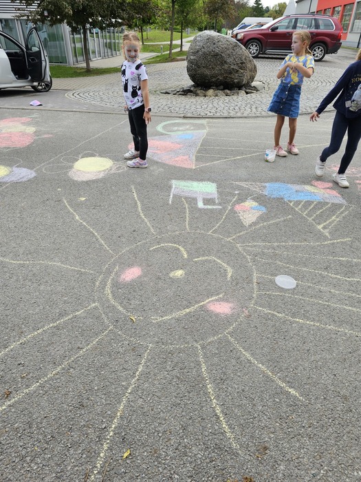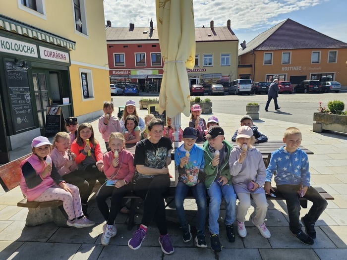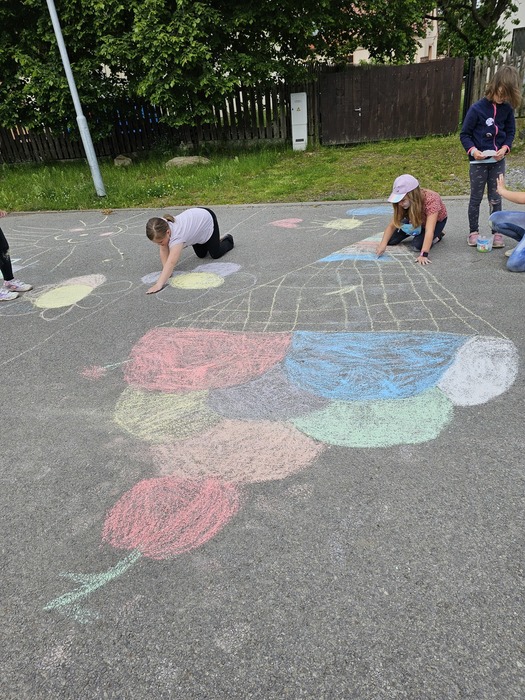 Program dne dětí byl nejen sladký, ale i plný barev, fantazie a týmové spolupráce. V pondělí 3. 6. jsme společně vyrazili na zmrzlinu ke „Kolouchovi“. Děti si pochutnaly na osvěžující sladké dobrotě a během cesty zpět se těšily na venkovní kreslení. Po návratu ke škole před budovu stacionáře jsme si asfaltové plátno rozdělili do čtyř úseků. Děti se rozdělily také do čtyř skupinek a každá skupinka dostala kelímek barevných kříd. Na chodníku vznikly obří zmrzliny, květiny, Šmoulové, celé město a jedna skupinka napsala na asfalt jména dětí z celé třídy.