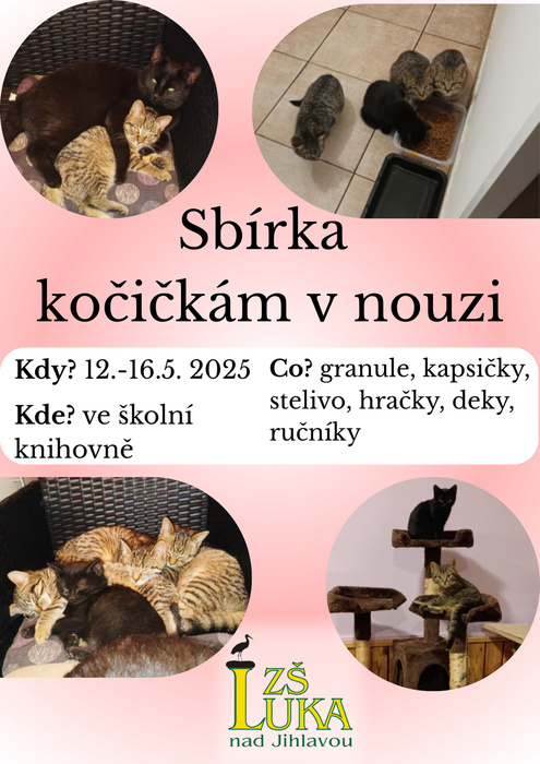 V týdnu od 12. do 16. května proběhne na naší škole sbírka pro kočky postižené výbuchem Kočkavárny v Havlíčkově Brodě. Děti mohou nosit granule, stelivo, kapsičky či jiné kočičí dobrotky, misky, škrabadla, hračky, ale i deky, ručníky ap. do školní knihovny.