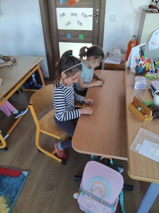 První dny jsme věnovali poznávání sebe navzájem pomocí různých her a aktivit, naučili jsme se nachystat si své místečko i jak se chovat v hodinách a o přestávkách. Poznali jsme, co má kdo rád i co do školy rozhodně nepatří, a hlavně – všude a všechno jsme podepisovali. Naše jména jsme psali tužkou do všech možných učebnic i na pomůcky, houbou namočenou ve vodě na chodník, provázkem i párátky, prostě čím to jen šlo.