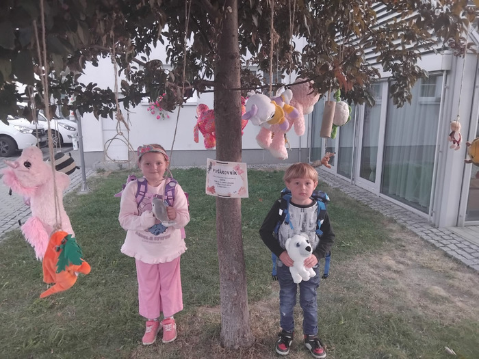 A v pátek? V pátek nás před stacionářem čekal strom „Plyšákovník“, ze kterého jsme si mohli utrhnout plyšáka za skvěle zvládnutý první týden ve škole. Děkujeme moc tomu, kdo jej pro nás přichystal…